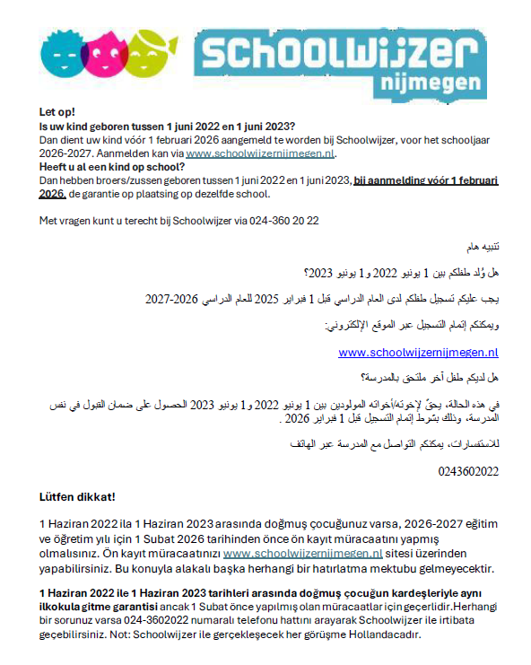 Als u een keus gemaakt heeft voor een (of onze) school, dan kunt u uw kind aanmelden via Schoolwijzer Nijmegen. U mag uw kind aanmelden vanaf de leeftijd van 2 jaar en 9 maanden. Door de nieuwe privacywet stuurt Schoolwijzer geen brieven meer om u eraan te herinneren om u kind aan te melden.